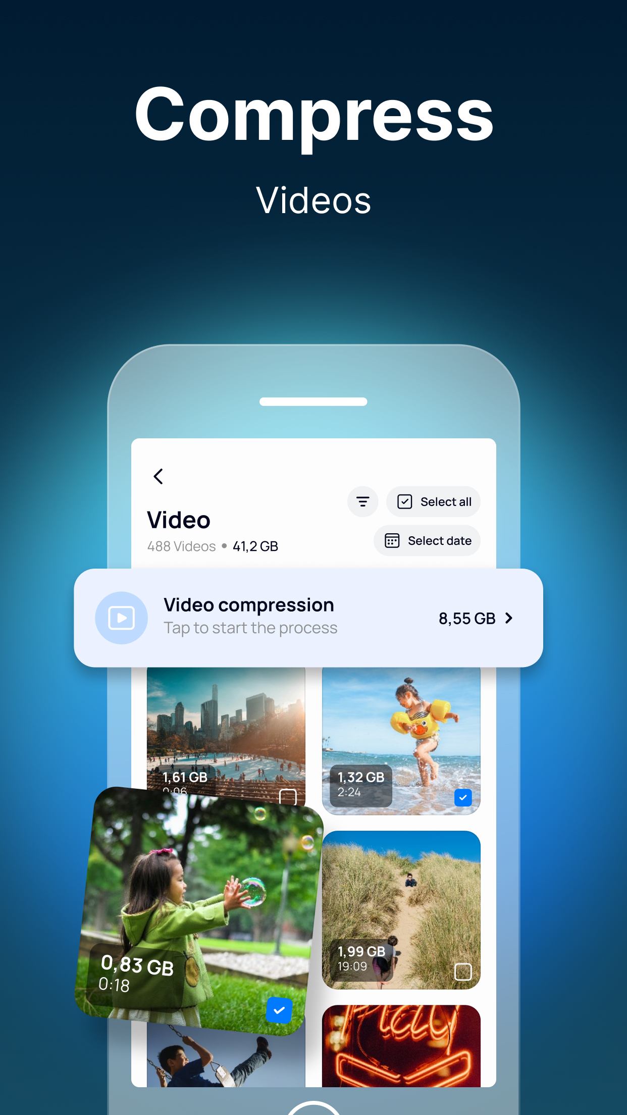 Reduce Video Sizes: Compress large video files without compromising quality, freeing up significant storage space for what truly matters.